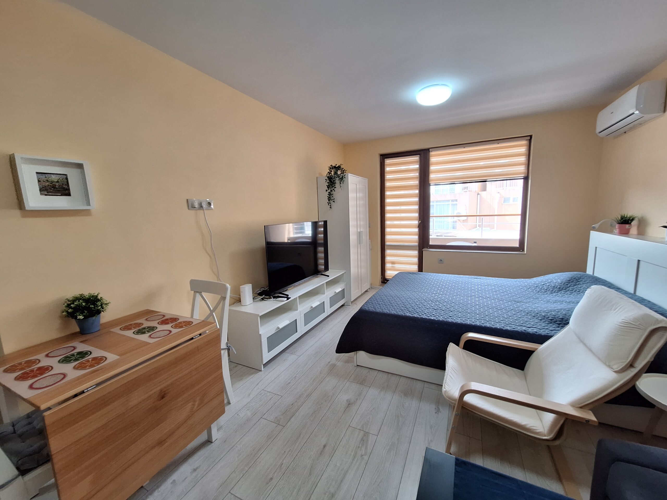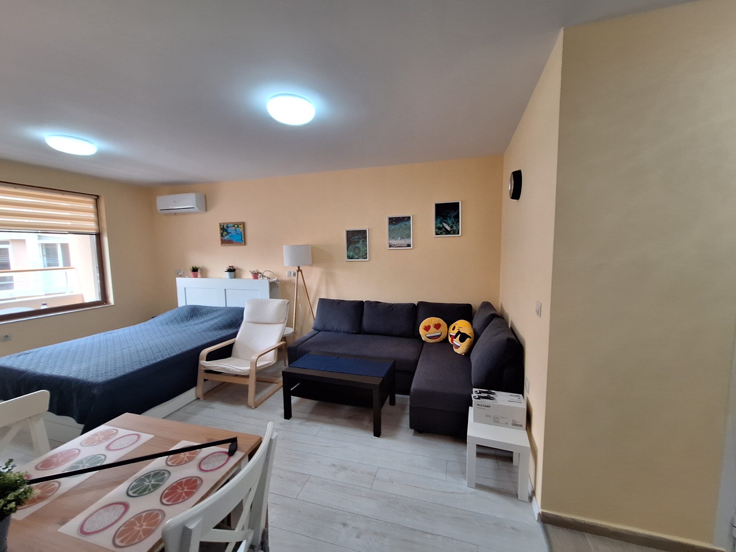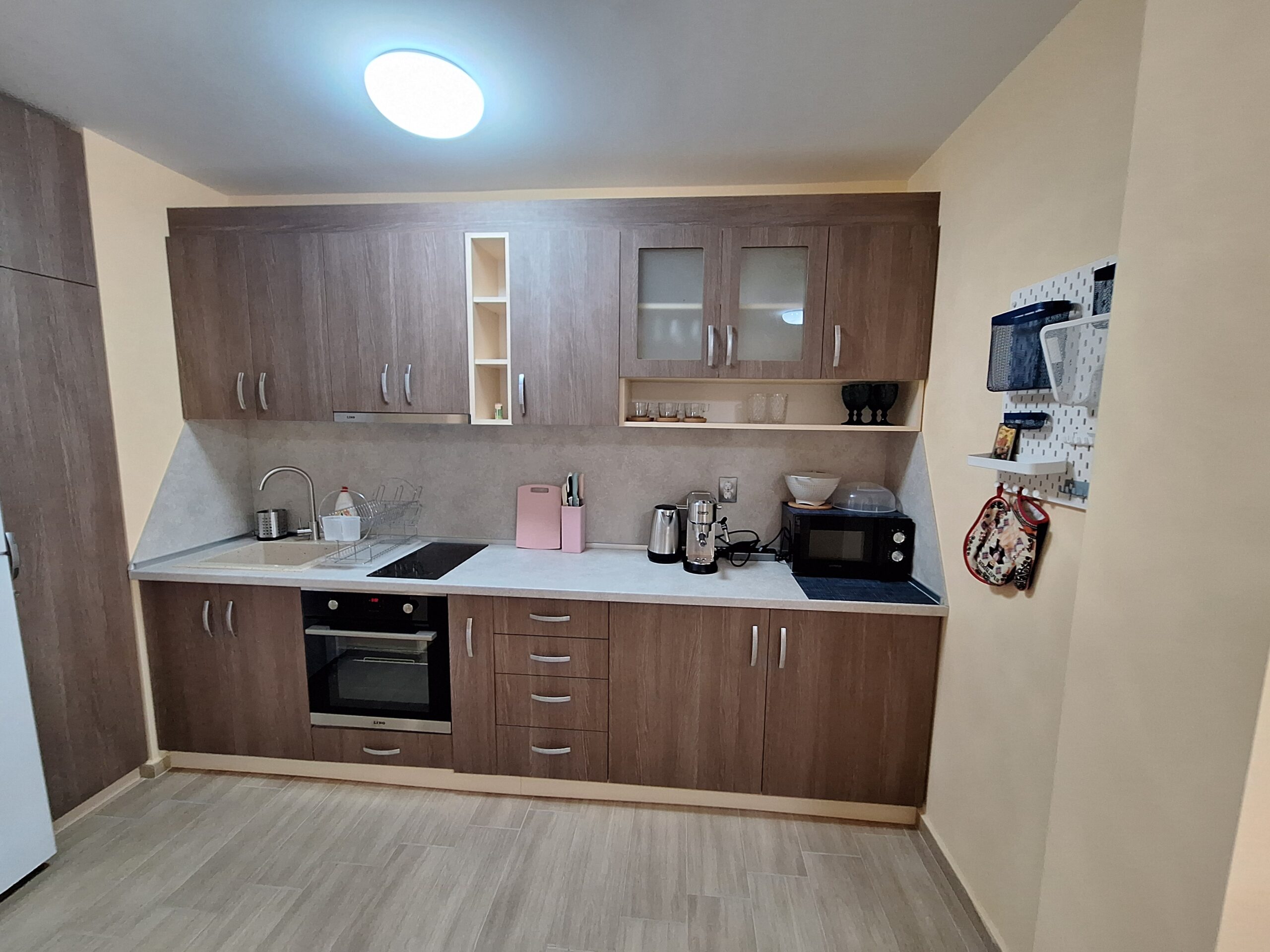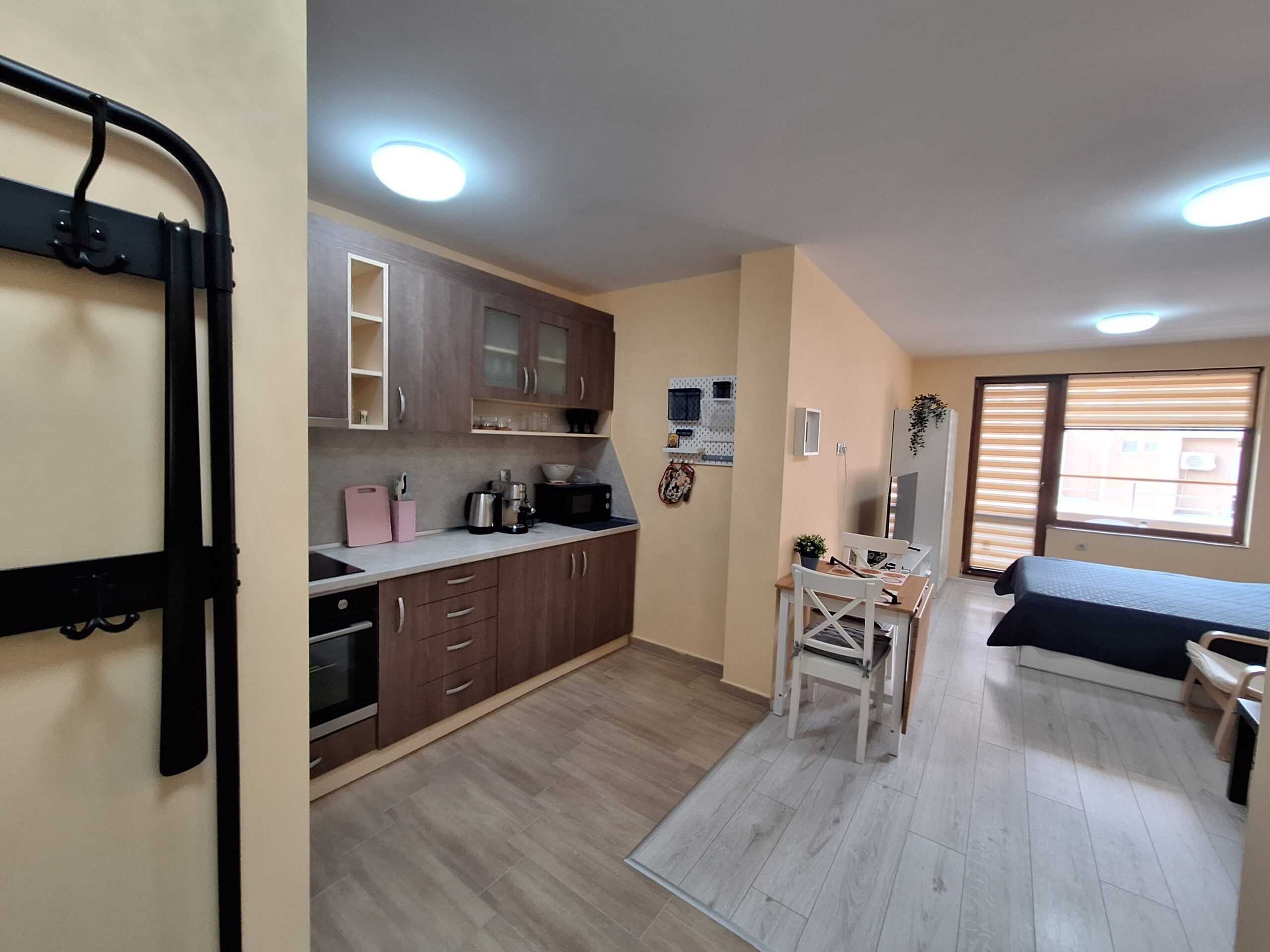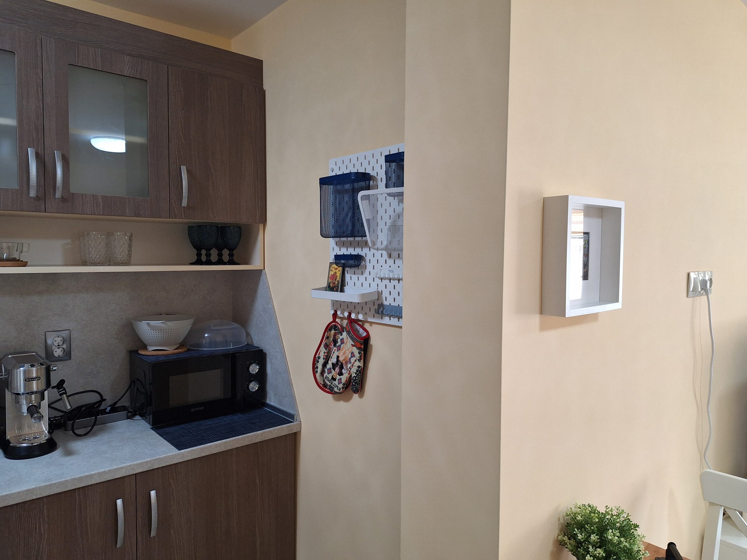 Das Studio bietet alle Annehmlichkeiten für Ihren Komfort und einen angenehmen Sommerurlaub. Es ist mit einer Küche ausgestattet, die einen Doppelherd, Backofen, Kaffeemaschine, Wasserkocher, Mikrowelle, Toaster, ein komplettes Set an Kochutensilien und Geschirr, Kühlschrank mit Gefrierfach umfasst. Die Immobilie befindet sich auf der 4. Wohnetage mit südöstlicher Ausrichtung, einem geräumigen Balkon, Doppelbett und Schlafsofa. Es bietet drei Schlafplätze, am besten geeignet für 2 Erwachsene und ein Kind.