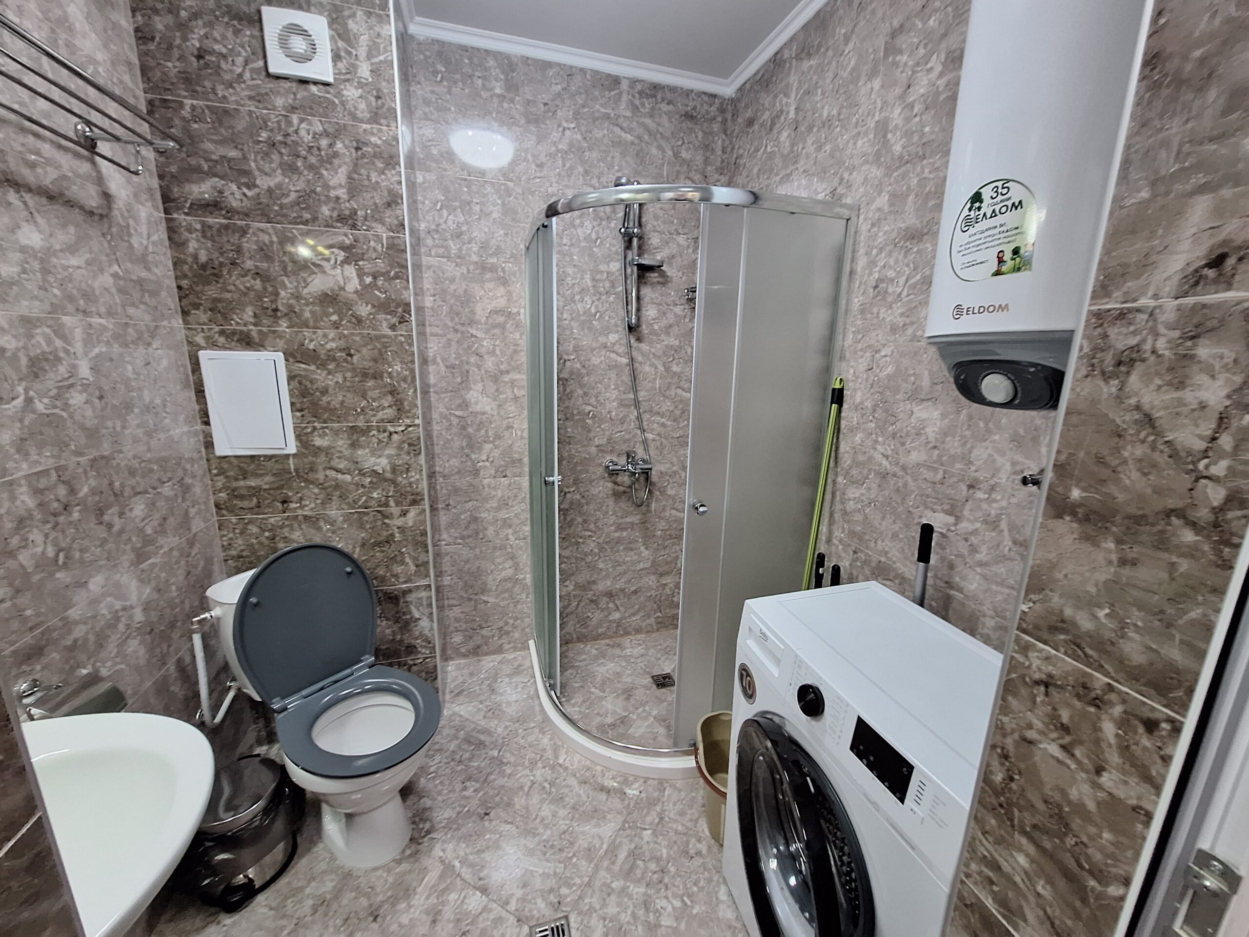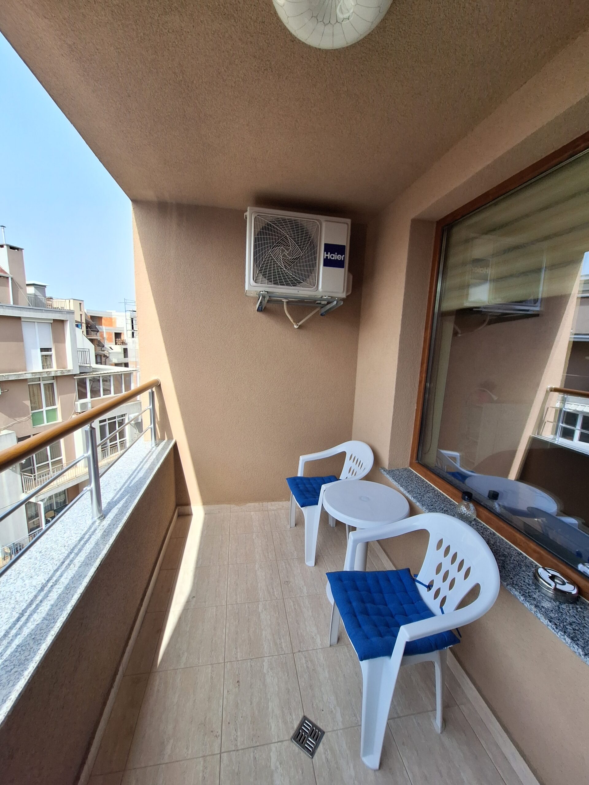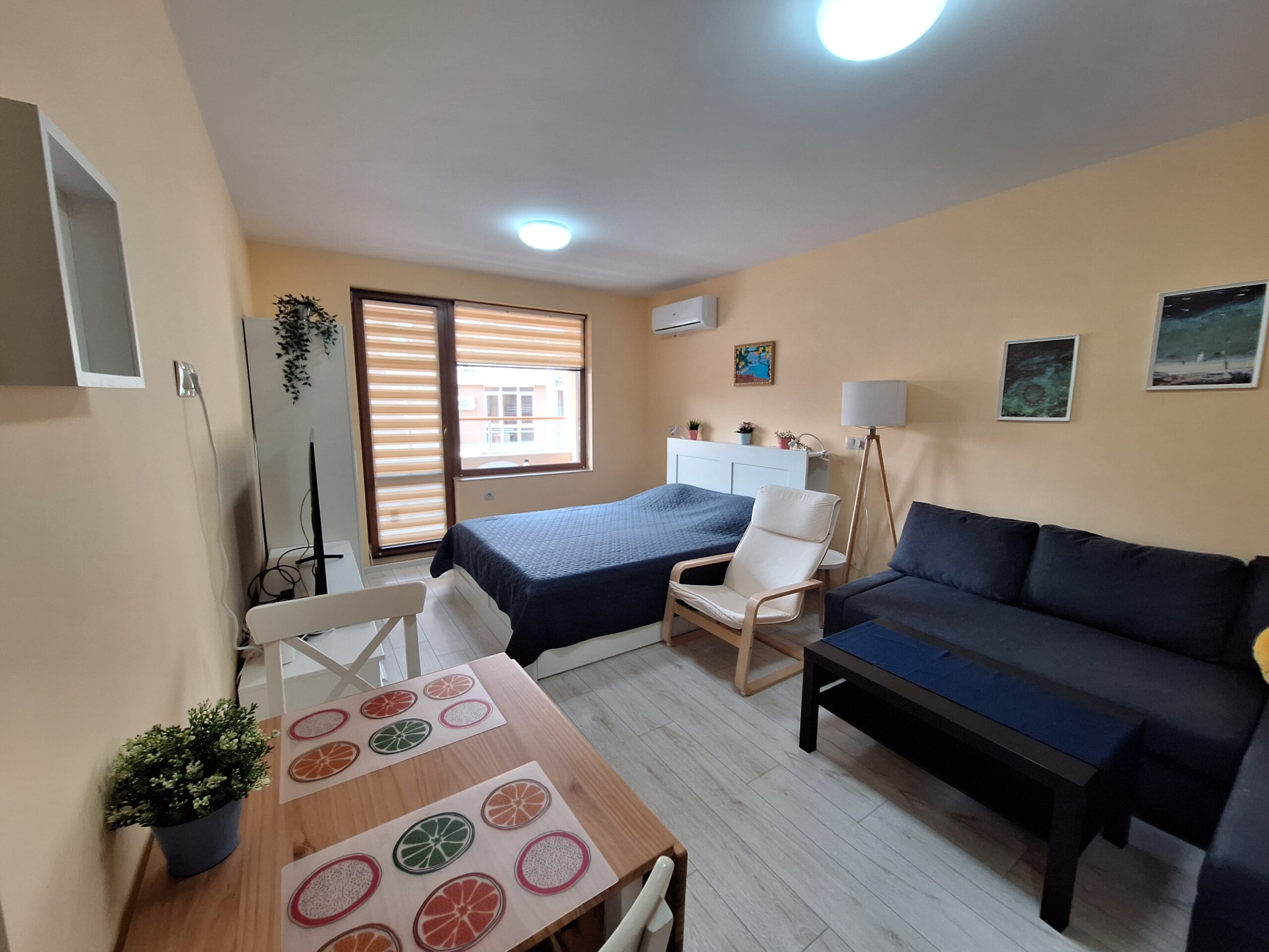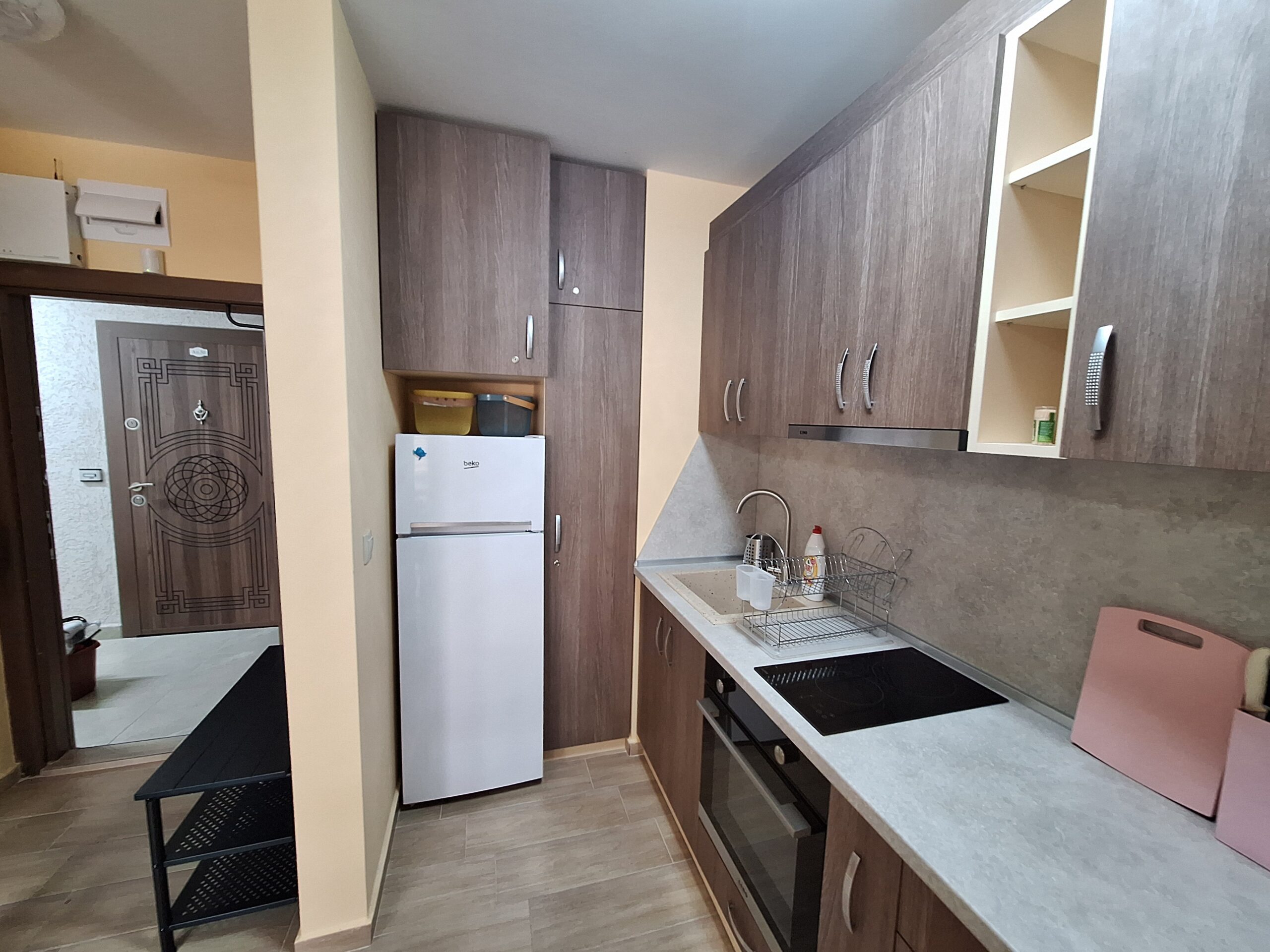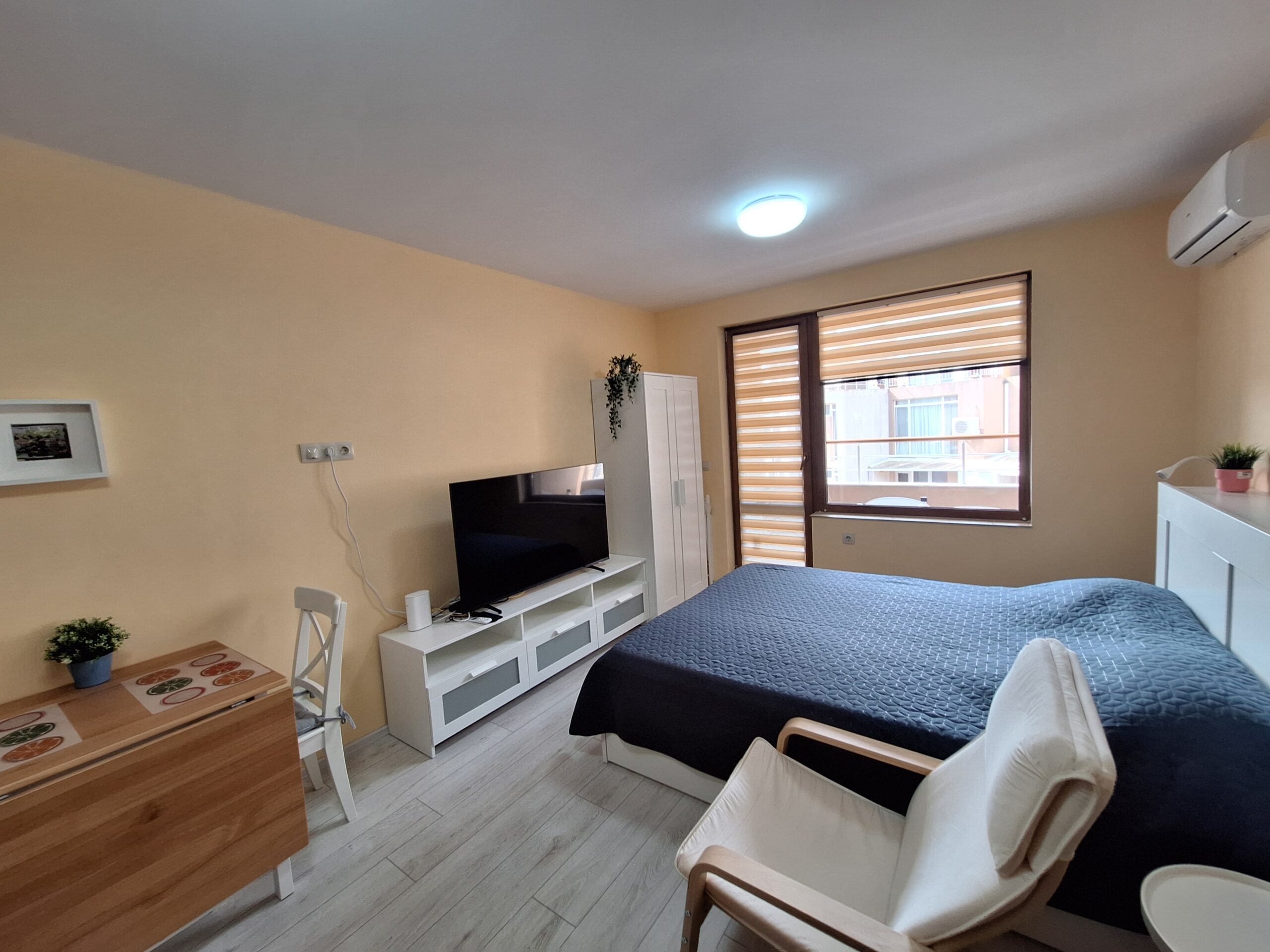 Das Studio bietet alle Annehmlichkeiten für Ihren Komfort und einen angenehmen Sommerurlaub. Es ist mit einer Küche ausgestattet, die einen Doppelherd, Backofen, Kaffeemaschine, Wasserkocher, Mikrowelle, Toaster, ein komplettes Set an Kochutensilien und Geschirr, Kühlschrank mit Gefrierfach umfasst. Die Immobilie befindet sich auf der 4. Wohnetage mit südöstlicher Ausrichtung, einem geräumigen Balkon, Doppelbett und Schlafsofa. Es bietet drei Schlafplätze, am besten geeignet für 2 Erwachsene und ein Kind.