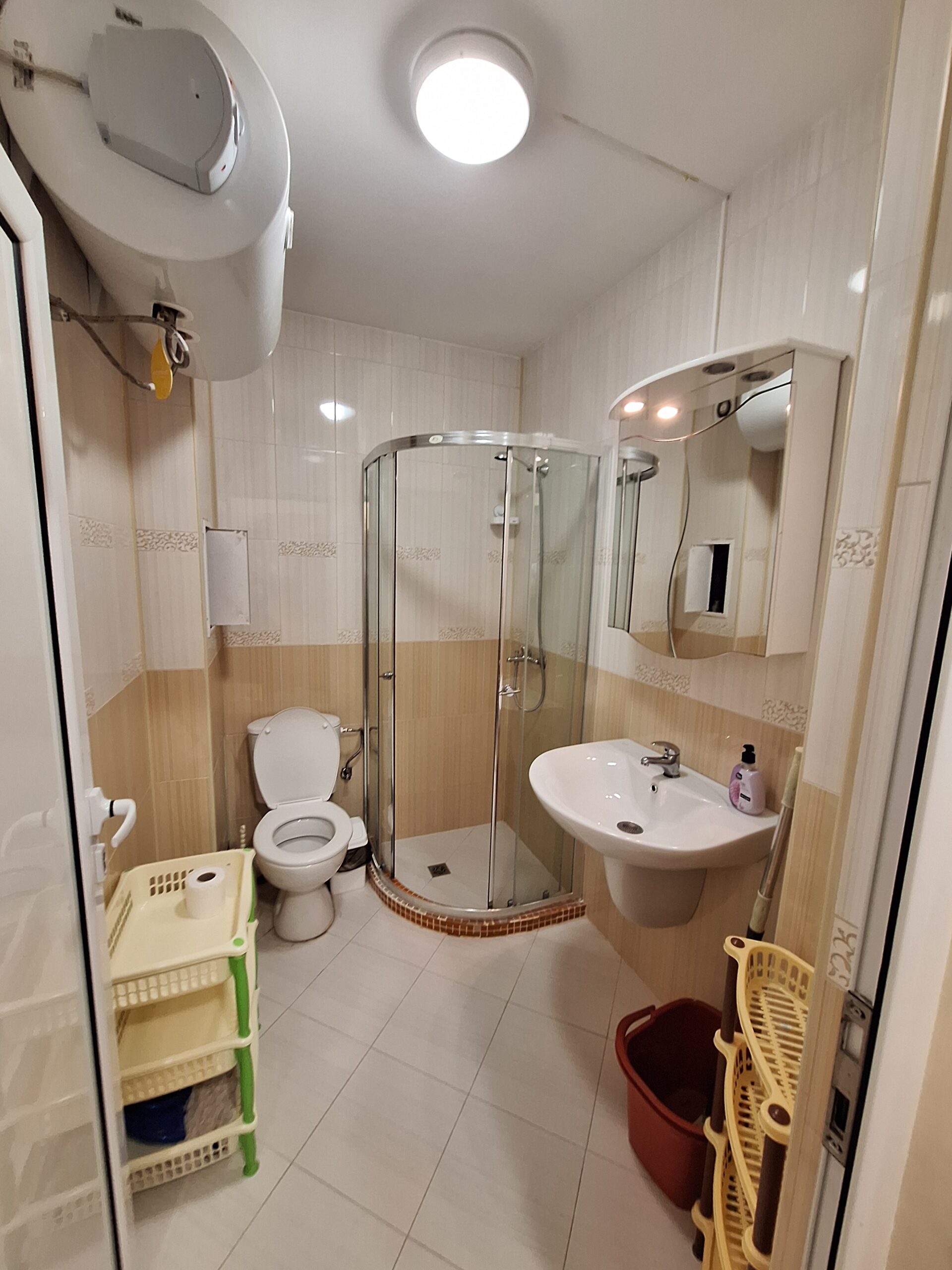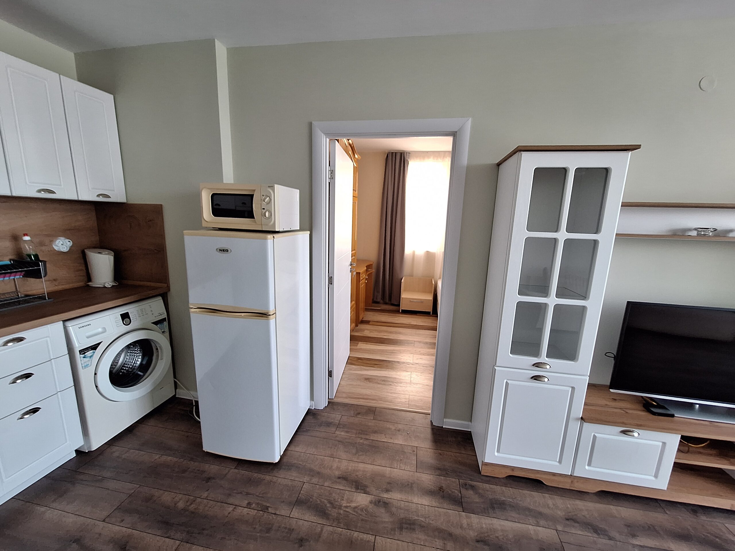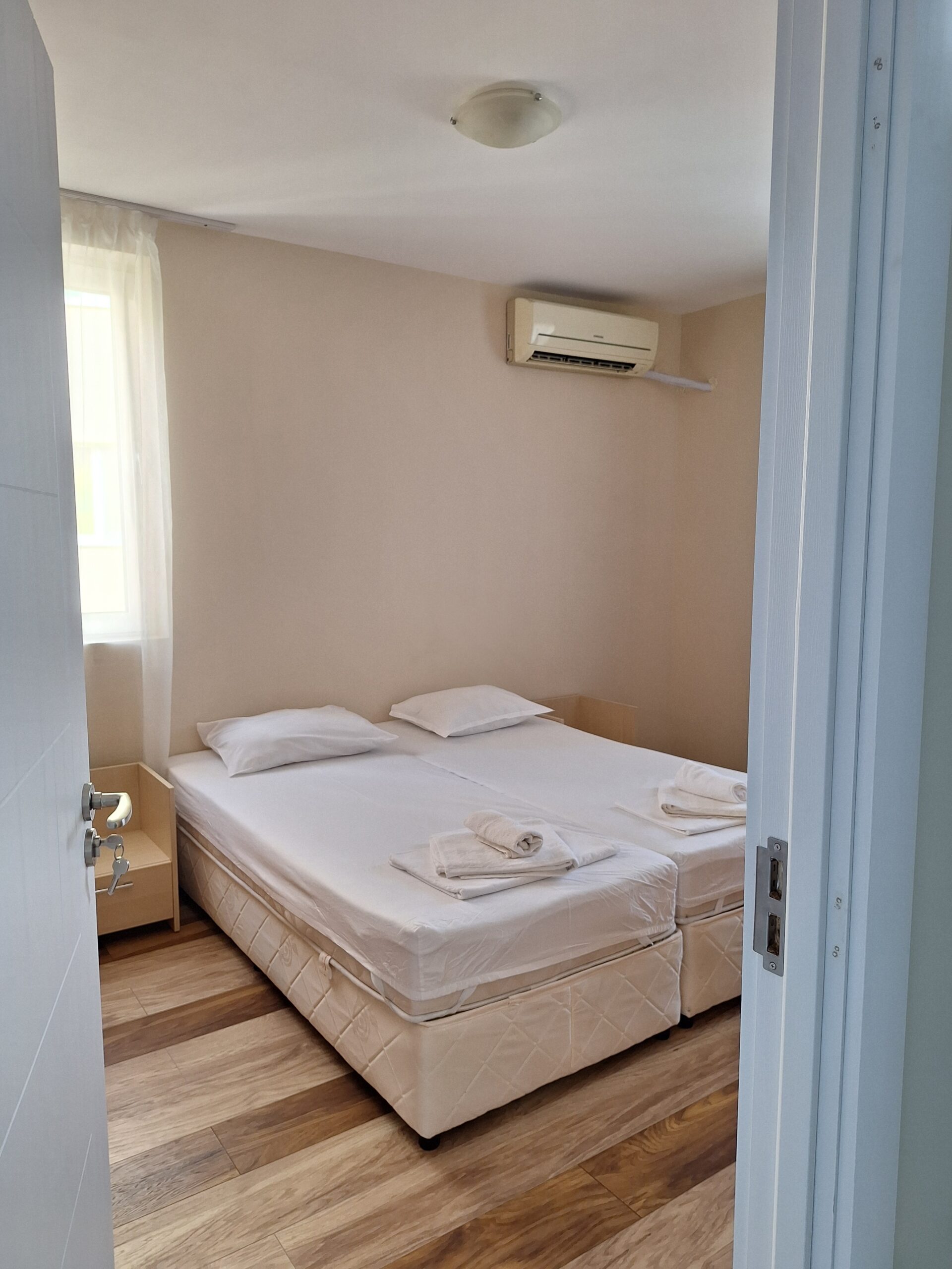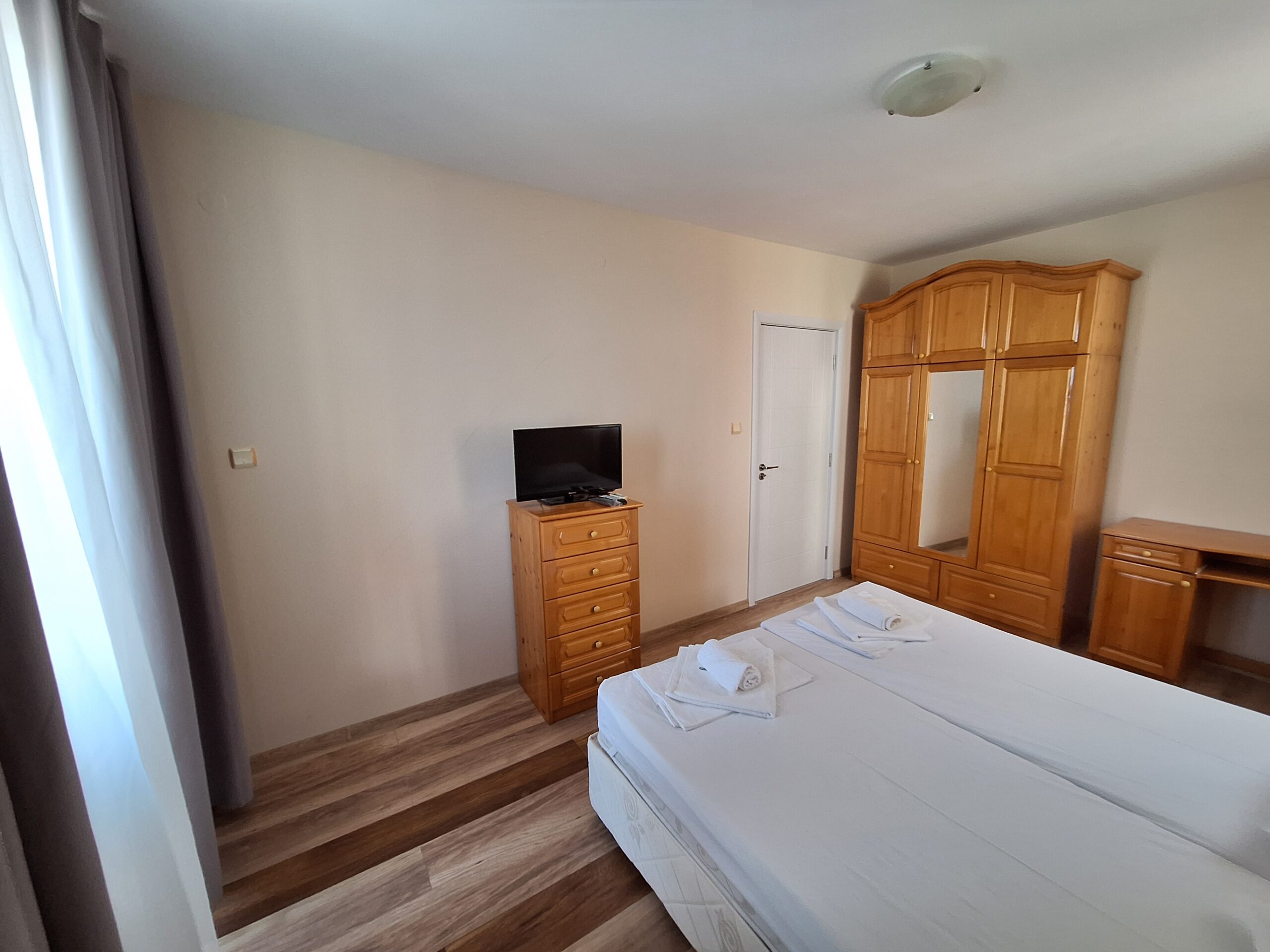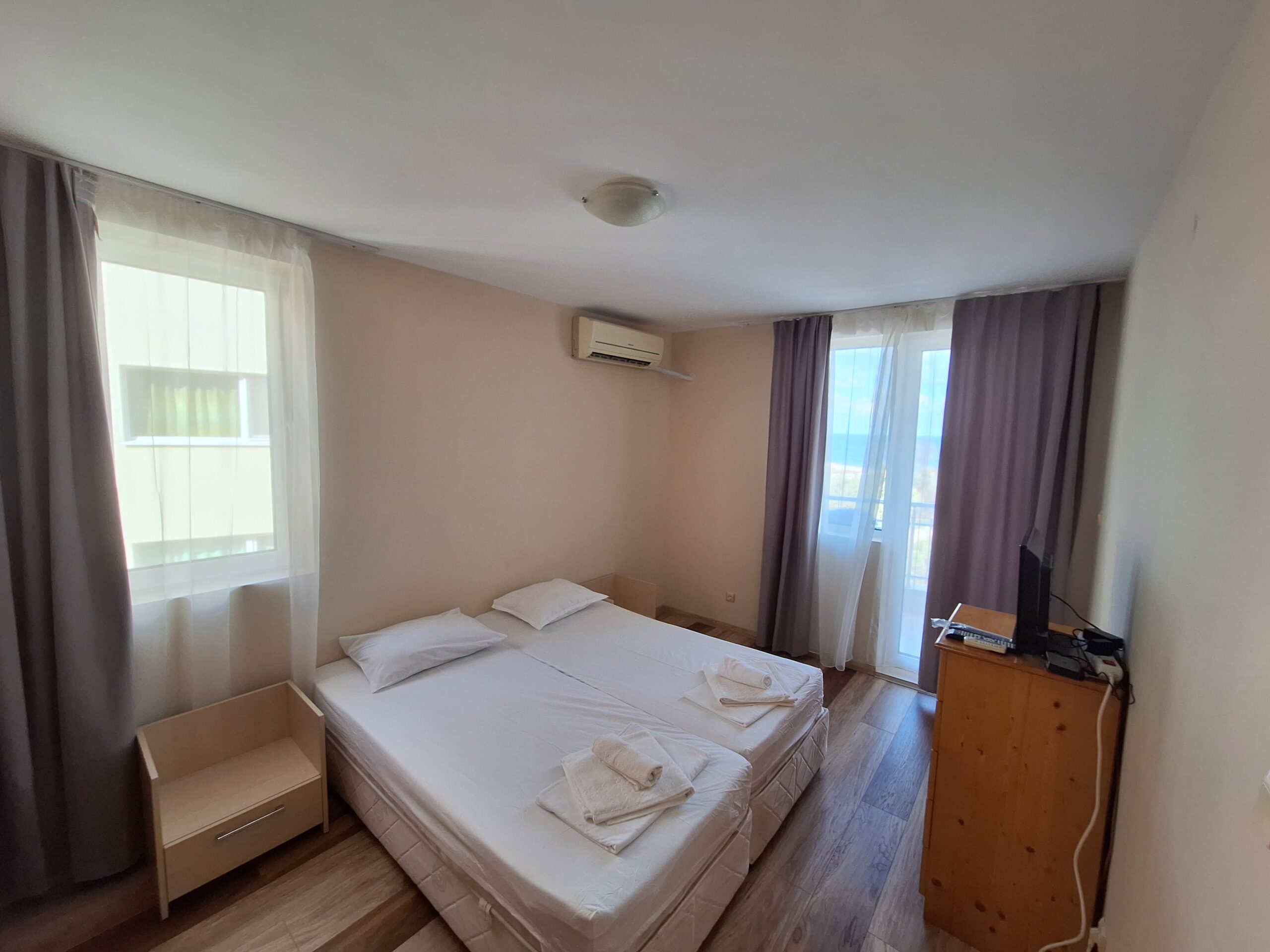 Просторно Ателие с источно изложение, на трети жилищен етаж с прекрасна гледка към плажа. Апартамента разполага с всички удобства за краткосрочен или по дълъг престой. Спалнята е оборудвана с 2 еденични легла които могат да се разделят, във всекидневната има разтегателен диван – подходящ за един възрастен и дете. Разполага с 2 климатика, оборудвана кухня с пълен набор от посуда, фурна, 2-ка котлон, хладилник с фризер, микровълнова печка, 2 телевизора, WiFi,и др.