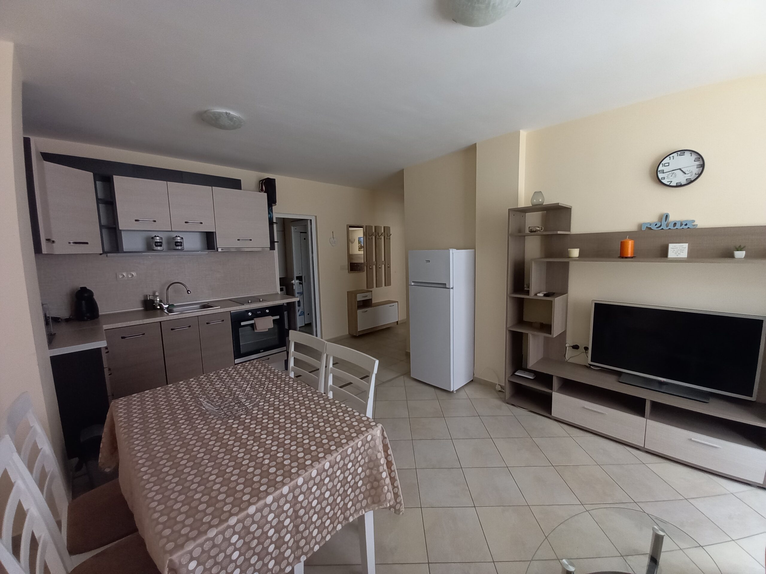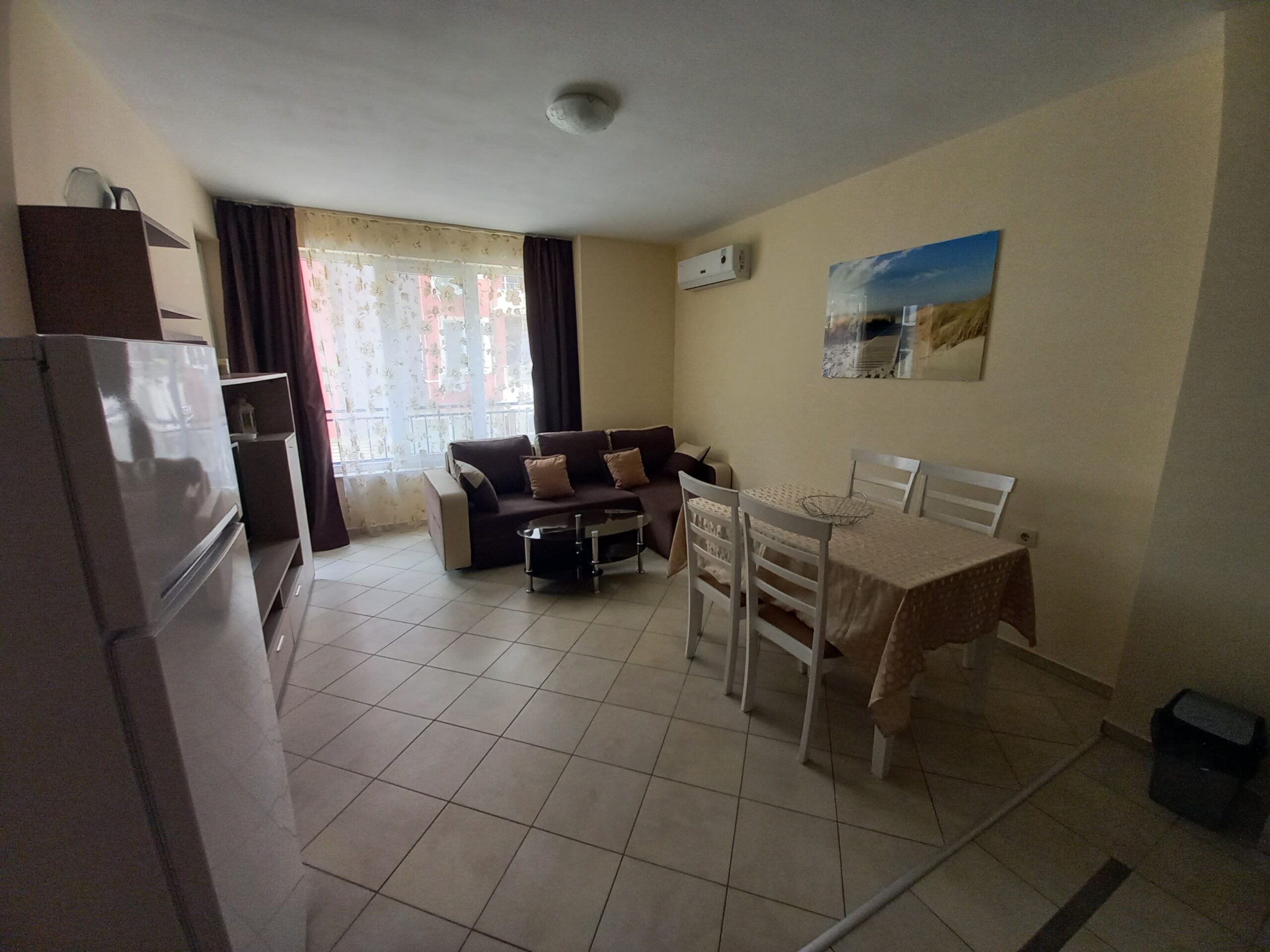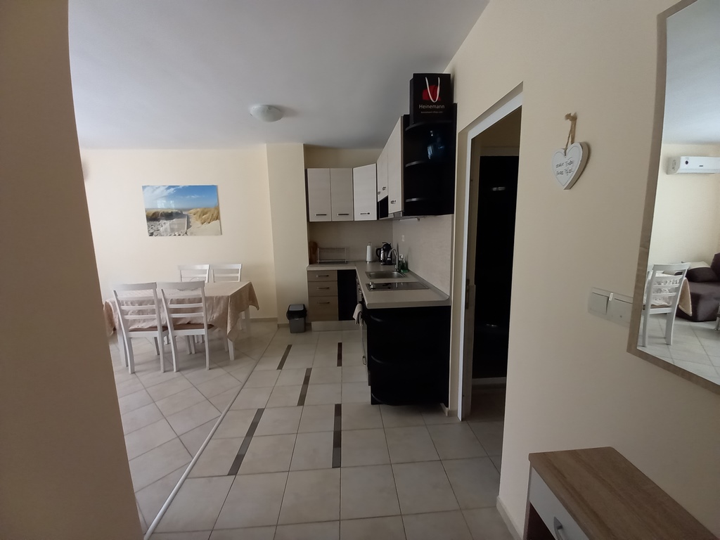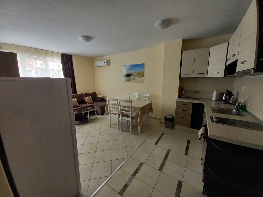 Прекрасен двустаен апартамент в района на Поликлиниката в гр. Поморие. Имота се намира на ул. Тутхон №15 на 1-ви жилищен етаж. Апартамента разполага със всекидневна, спалня санитарен възел, мокро помещение и балкон. Напълно оборудван за удобен и приятен престой и отдих до морето, имота е удобен за семейства с 1 или 2 деца. Плажа е само на 200 метра, в близост до сградата има супермаркет и няколко магазина за плодове и зеленчуци, в района има ресторанти и пекарни, денонощни магазини, пешеходната улица е на около 600 метра.