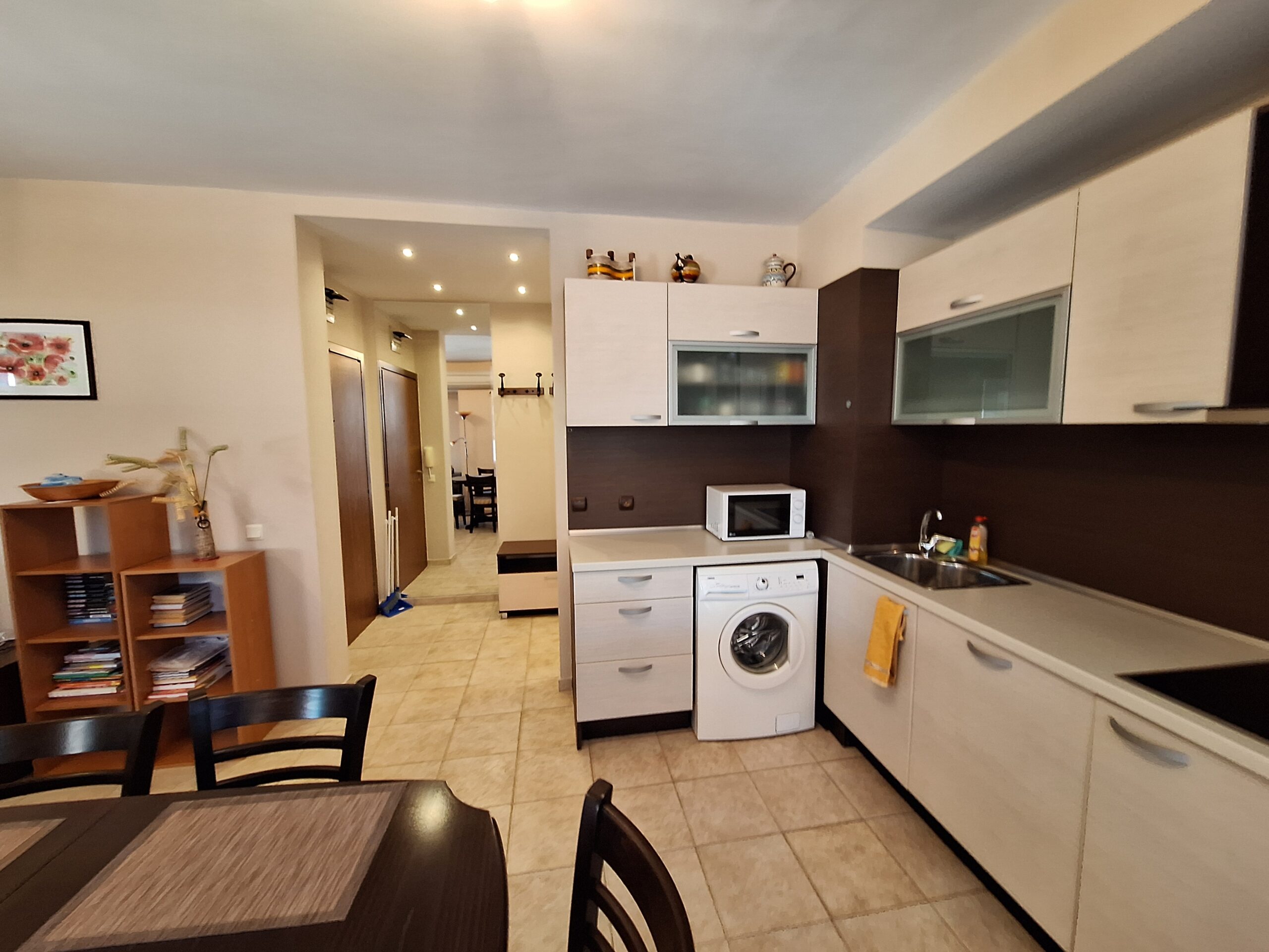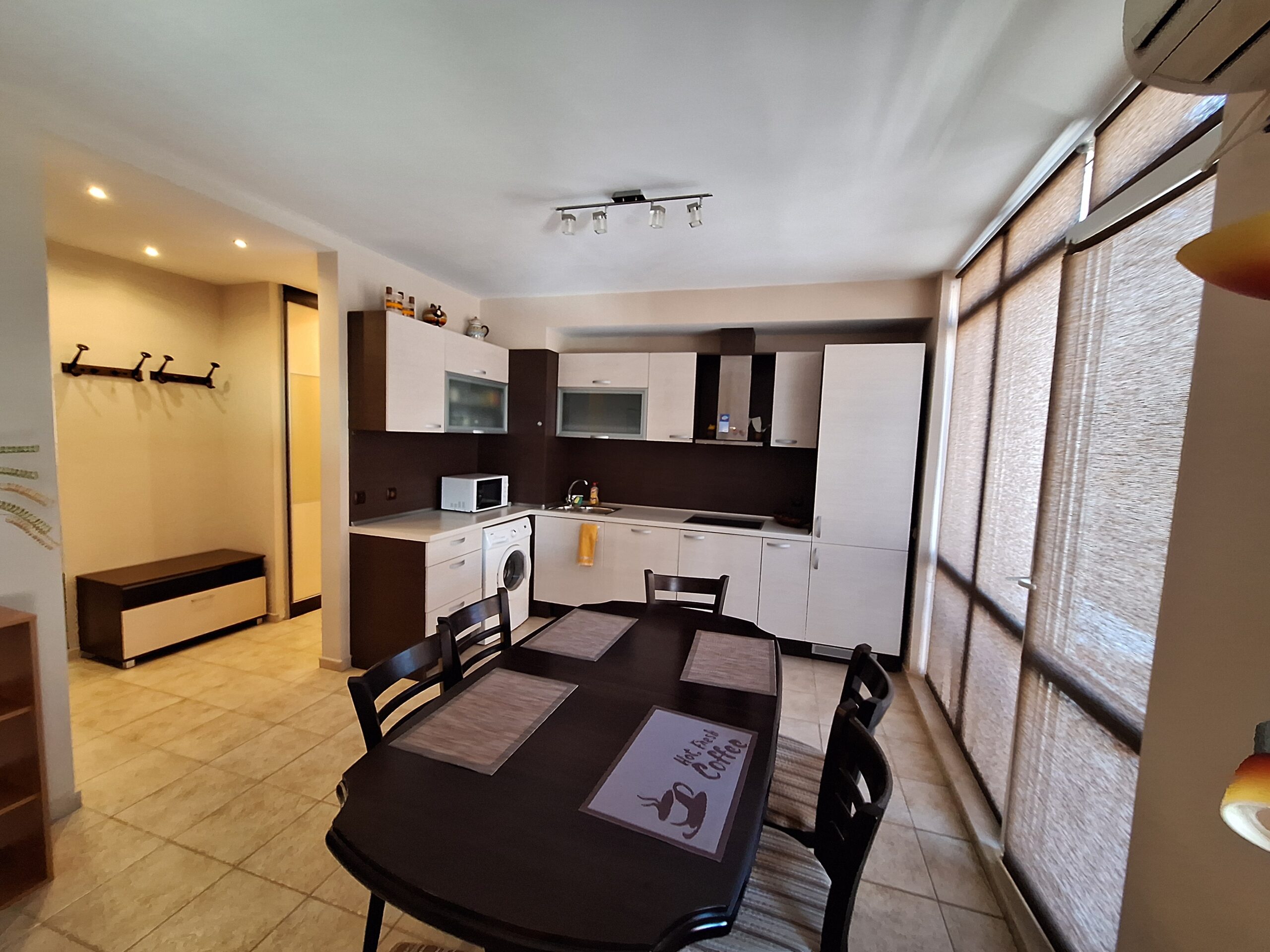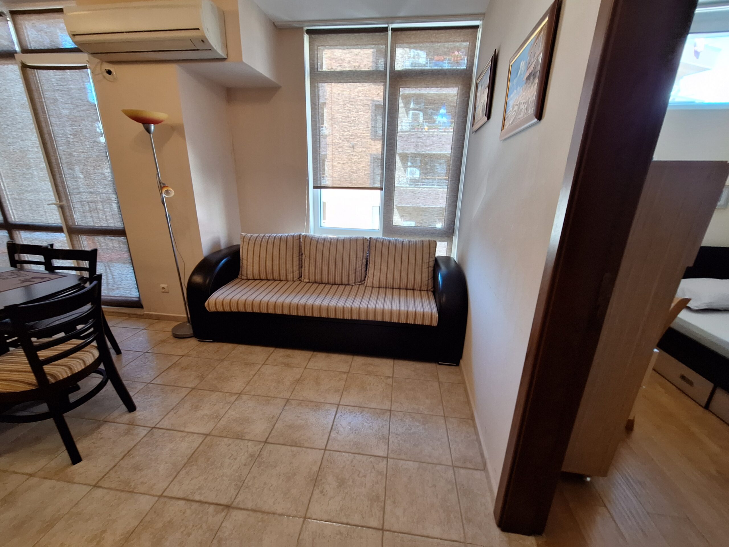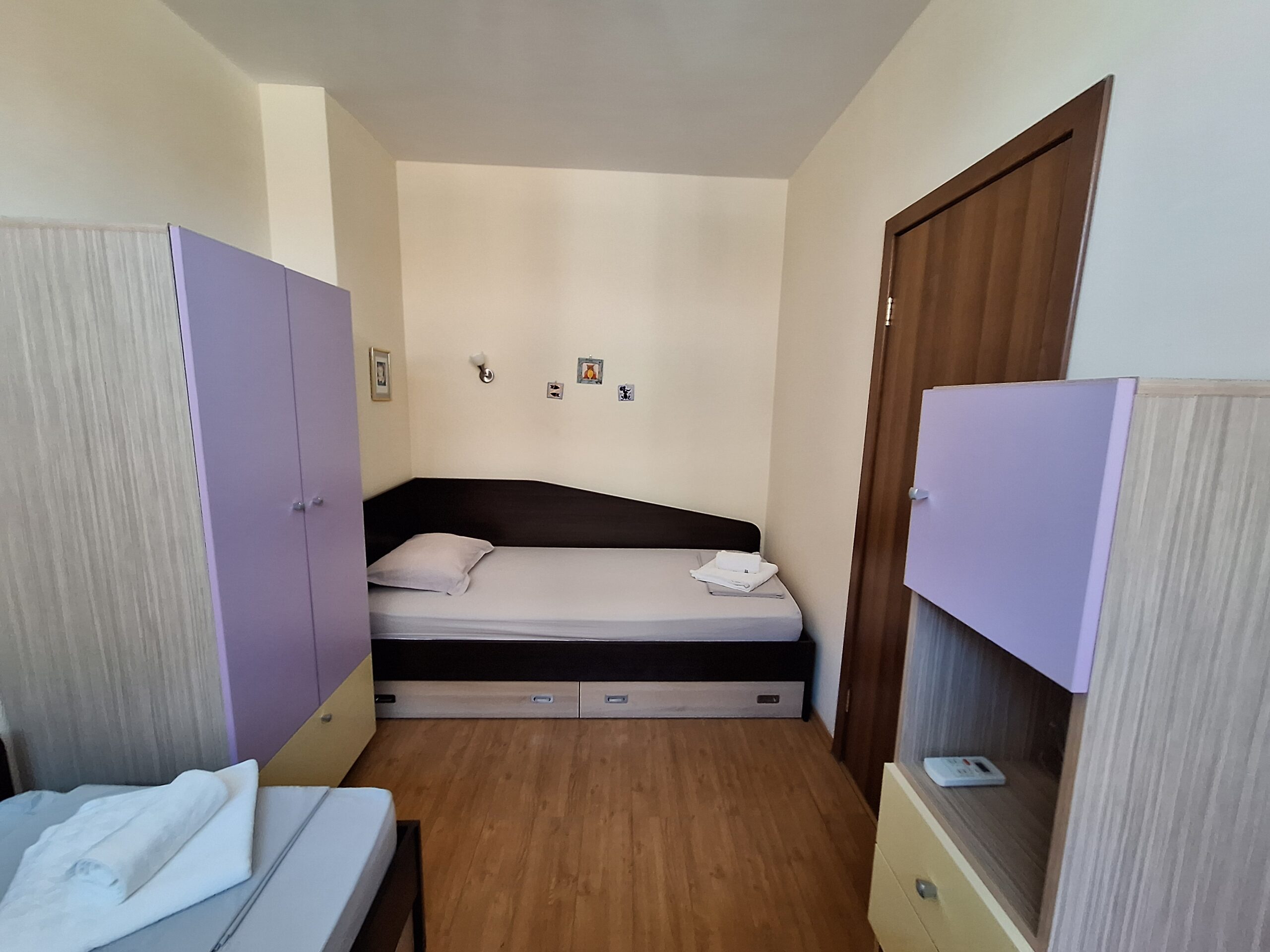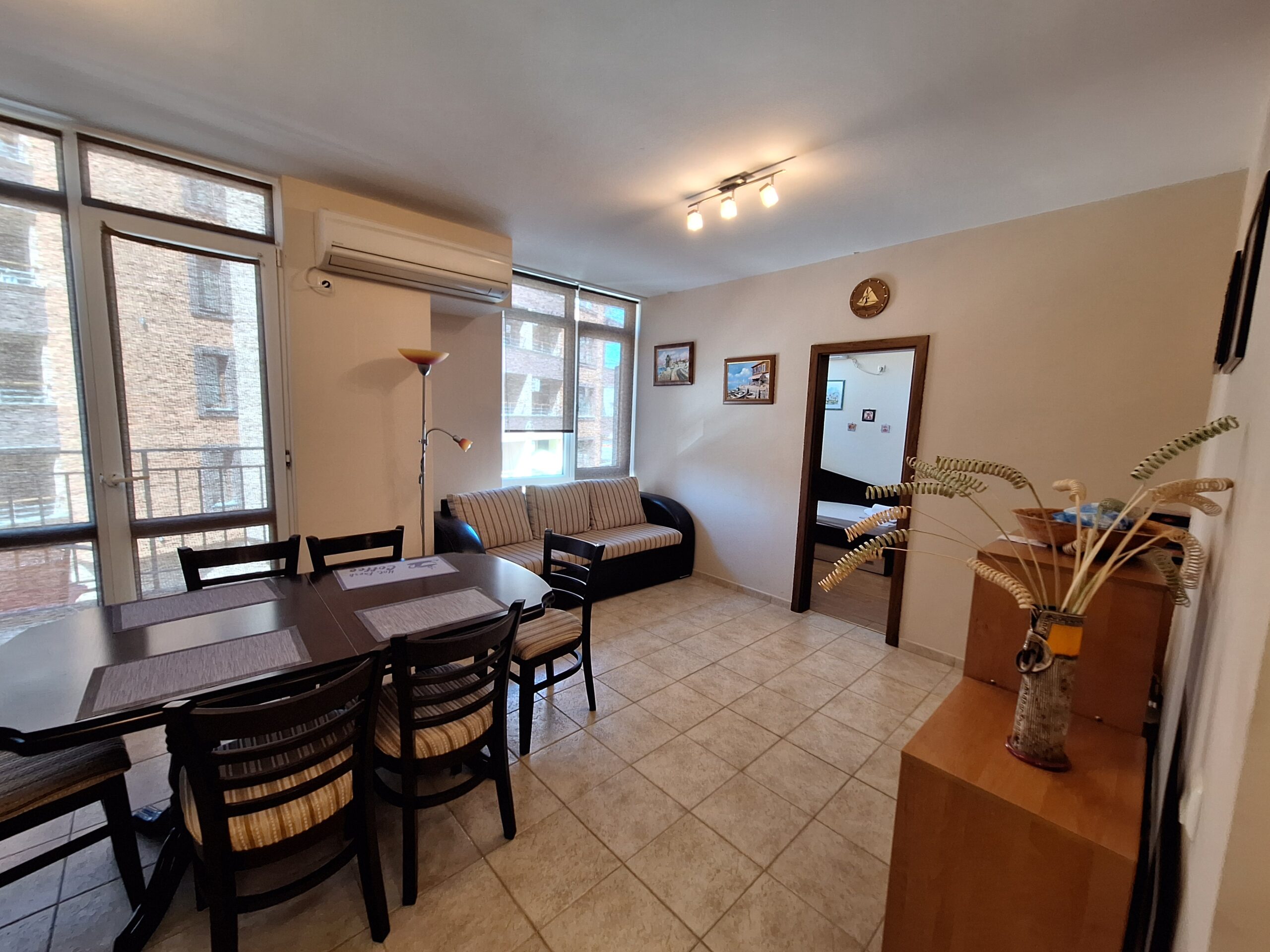 Компактен тристаен апартамент разположен в сграда на ул. Панайот Хитов и ул. Македония, на гърба на болницата в Поморие. Апартамента се намира на втори жилищен етаж в сграда с асансьор, разполага с една спалня, детска стая с 2 легла, всекидневна с кухненска зона, санитарен възел и тераса. Кухнята е напълно оборудвана даже и за по дълъг престой. Дистанцията до най близкия плаж е около 700 метра, центъра е на близо, южната крайбрежна алея е на около 300 метра.